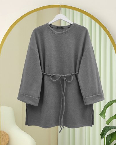 Kolu Katlı Beli Bağlamalı Yırtmaçlı Kaşkorse Tunik Gri