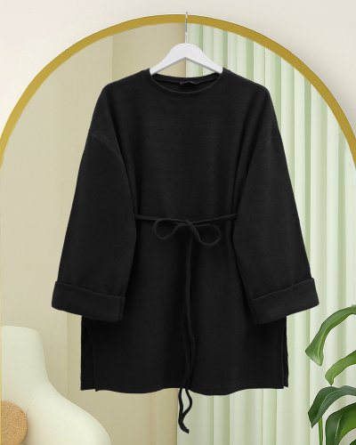 Kolu Katlı Beli Bağlamalı Yırtmaçlı Kaşkorse Tunik Siyah