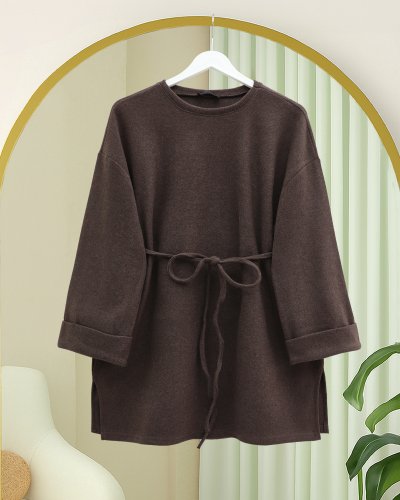 Kolu Katlı Beli Bağlamalı Yırtmaçlı Kaşkorse Tunik Toprak