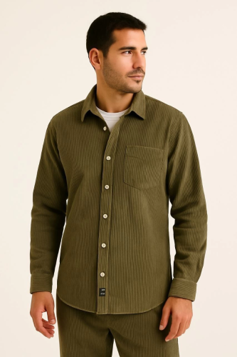 • Erkek Fitilli Kadife Cepli Gömlek Oversize Rahat Kalıp Haki