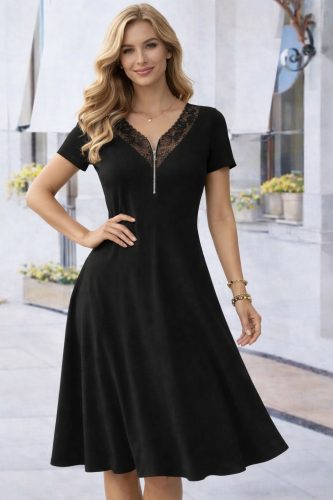 • Kadın kısa kollu dantel v fermuar yakalıuzun viskon elbise