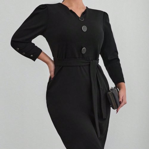 Kadın uzun kollu düğme detaylı kendinden kemerli ithal krep elbise