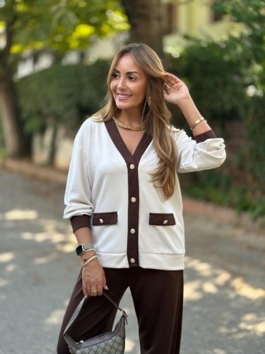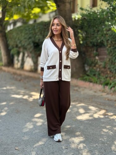 • Kadın uzun kollu ribanali cep detay hırka ve bol paça pantolon ikili takım
