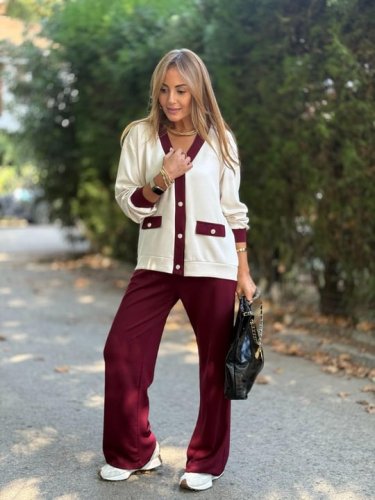 • Kadın uzun kollu ribanali cep detay hırka ve bol paça pantolon ikili takım