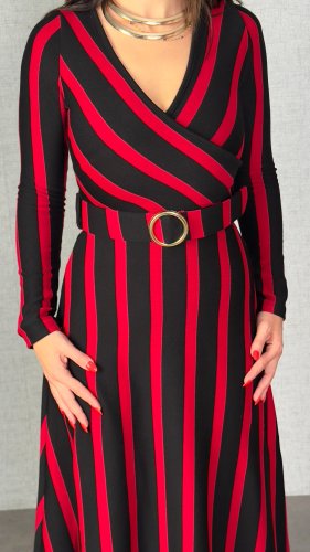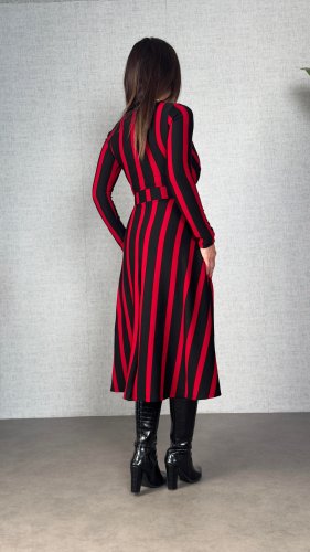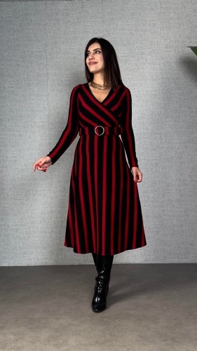 • Kadın uzun kollu kruvaze yaka kemer dahil çizgili triko elbise